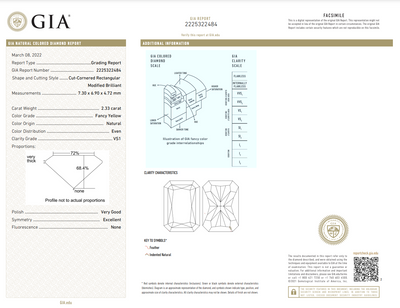 Exquisitely crafted and perfectly proportioned, this three-stone ring is a picture of delicate elegance. The 2.28 ct fancy light yellow cushion-cut diamond at its center has a soft, sunny hue that is both charming and sophisticated. It is flanked by two brilliant round diamonds, a classic choice that adds an extra touch of sparkle and fire. This is a beautifully balanced piece for those who appreciate understated luxury.