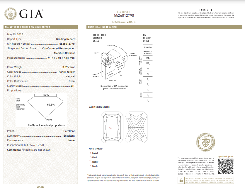 A beautifully elongated Fancy Yellow Radiant Cut diamond, richly saturated in color and perfectly proportioned with a striking one to three elongation ratio.
