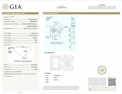 A GIA certified diamond ring with a 3.50 Carat Fancy Yellow center elongated radiant cut diamond center. Featuring all around Very Good cutting and VS2 Clarity. Enhanced by 0.64 Carat E VS+ epaulette sidestones. This ring was handmade in NYC and is crafted in 18k gold and platinum.