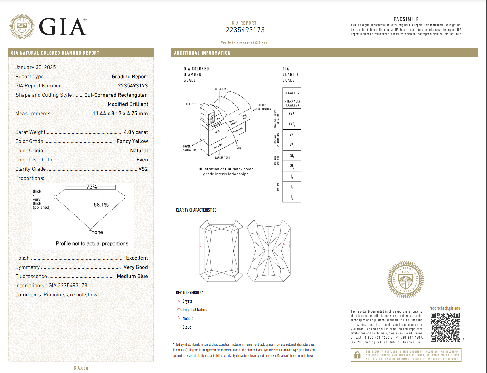 A striking balance of rarity and craftsmanship, this engagement ring centers a 4.04 carat Fancy Yellow elongated radiant cut diamond of VS2 clarity. Its vibrant color is framed by a pair of half moon side stones totaling 0.64 carats, both GIA certified and exceptionally pure at D VVS1 and D VVS2. With three certified diamonds in total, the design highlights precision and refinement, crafted in a harmonious mix of platinum and 18k yellow gold. Handmade in New York City, it is a statement of timeless sophistication.