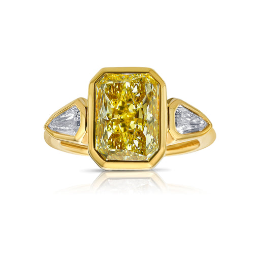 Modern, sleek, and exceptionally chic, this ring is for the person with a minimalist sensibility and an eye for design. It features a 2.02 ct fancy light yellow radiant-cut diamond, securely wrapped in a contemporary bezel setting that highlights its clean, geometric lines. The center stone is flanked by two smaller bezel-set trapezoid diamonds, continuing the theme of sharp, artistic style. It’s a unique and sophisticated take on the classic three-stone ring.