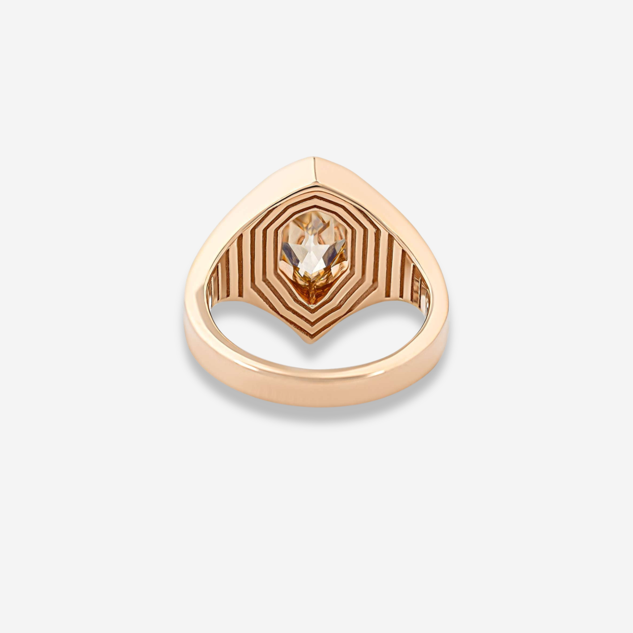 This unique champagne diamond ring features a natural Fancy Brown-Yellow pear-shaped step cut diamond, surrounded by a halo of white baguette diamonds that beautifully highlight the center stone. Set in warm rose gold, the design enhances the rich golden tones for a stunning look.