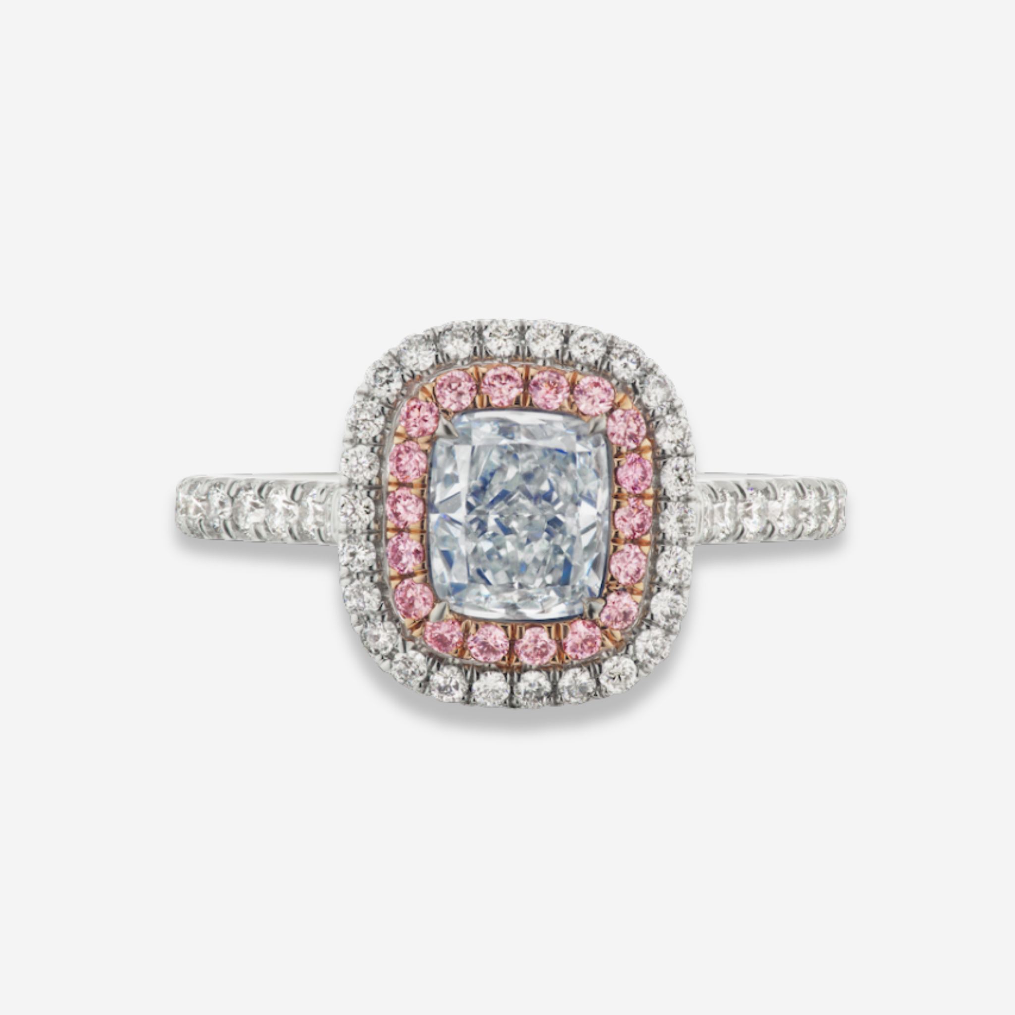 This blue cushion diamond ring with pink pave is a stunning and unique piece of jewelry that combines two rare and beautiful gemstones. The soft and rounded edges of the cushion cut diamond provide a vintage-inspired look, while the pink pave adds a pop of color and femininity. A one-of-a-kind piece that will turn heads and spark conversation.  Learn more about blue diamonds here