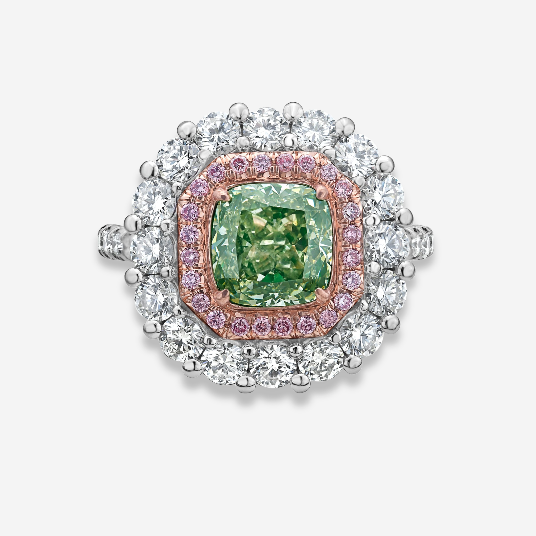 A unique green diamond ring, in a two-stone bypass ring style, with a natural green diamond taking center stage.