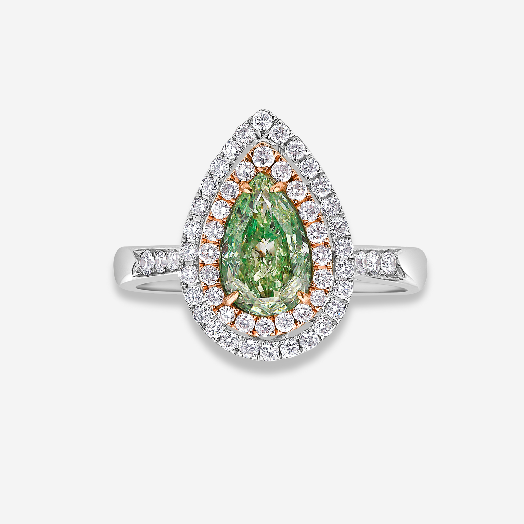 1.01 Carat Fancy Light Brownish Greenish Yellow Pear 0.50 Carats of surrounding diamonds VS1 Clarity Very Good, Excellent, None Fluorescence Handset in 18k Gold GIA Certified Diamond.