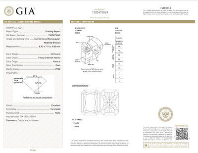 Classic with a colorful twist, this three-stone ring is effortlessly chic. The centerpiece is a stunning 3.01 ct radiant-cut diamond with a unique and alluring greenish-yellow hue. Radiant cuts are beloved for their incredible fire, and this stone does not disappoint, offering a dazzling sparkle from every angle. Two perfectly matched trapezoid-cut diamonds on either side add a touch of geometric elegance, creating a look that feels both timeless and perfectly modern.