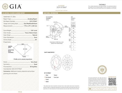 Fancy yellow-green oval diamond pendant with a double halo design and SI1 clarity.