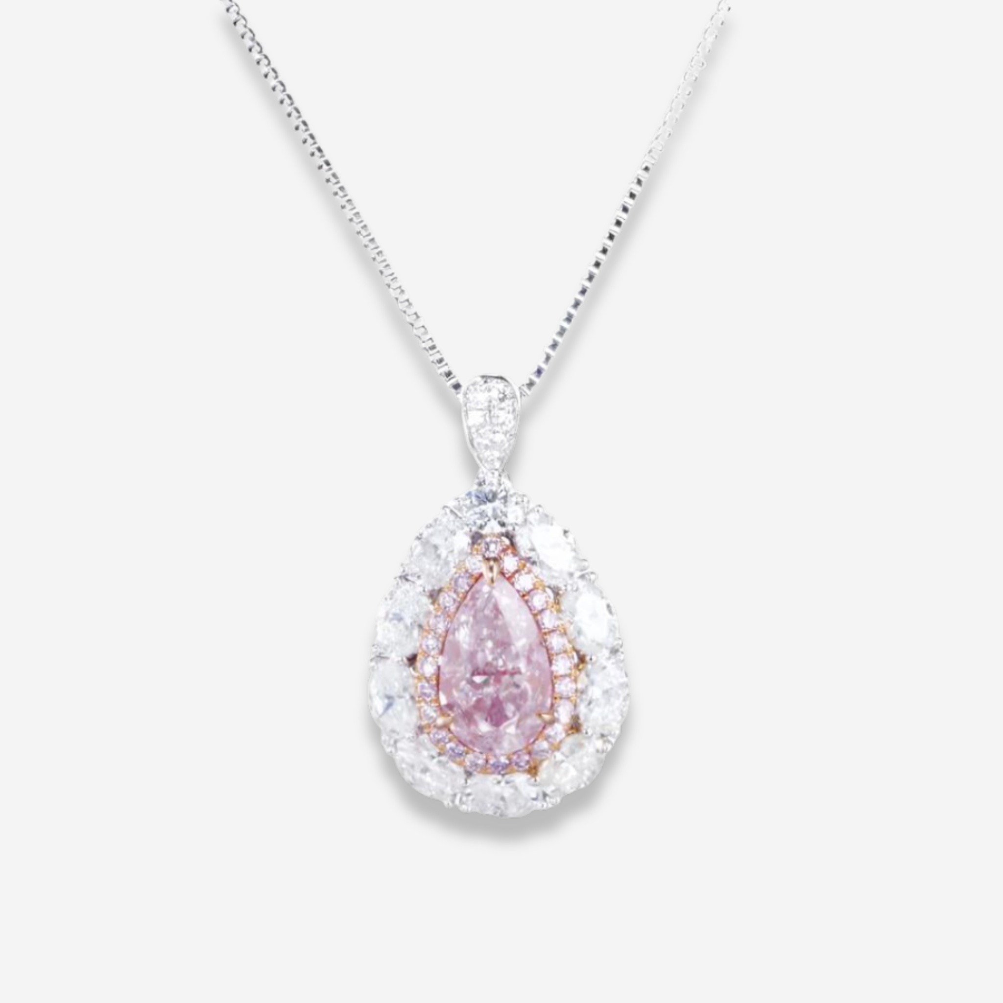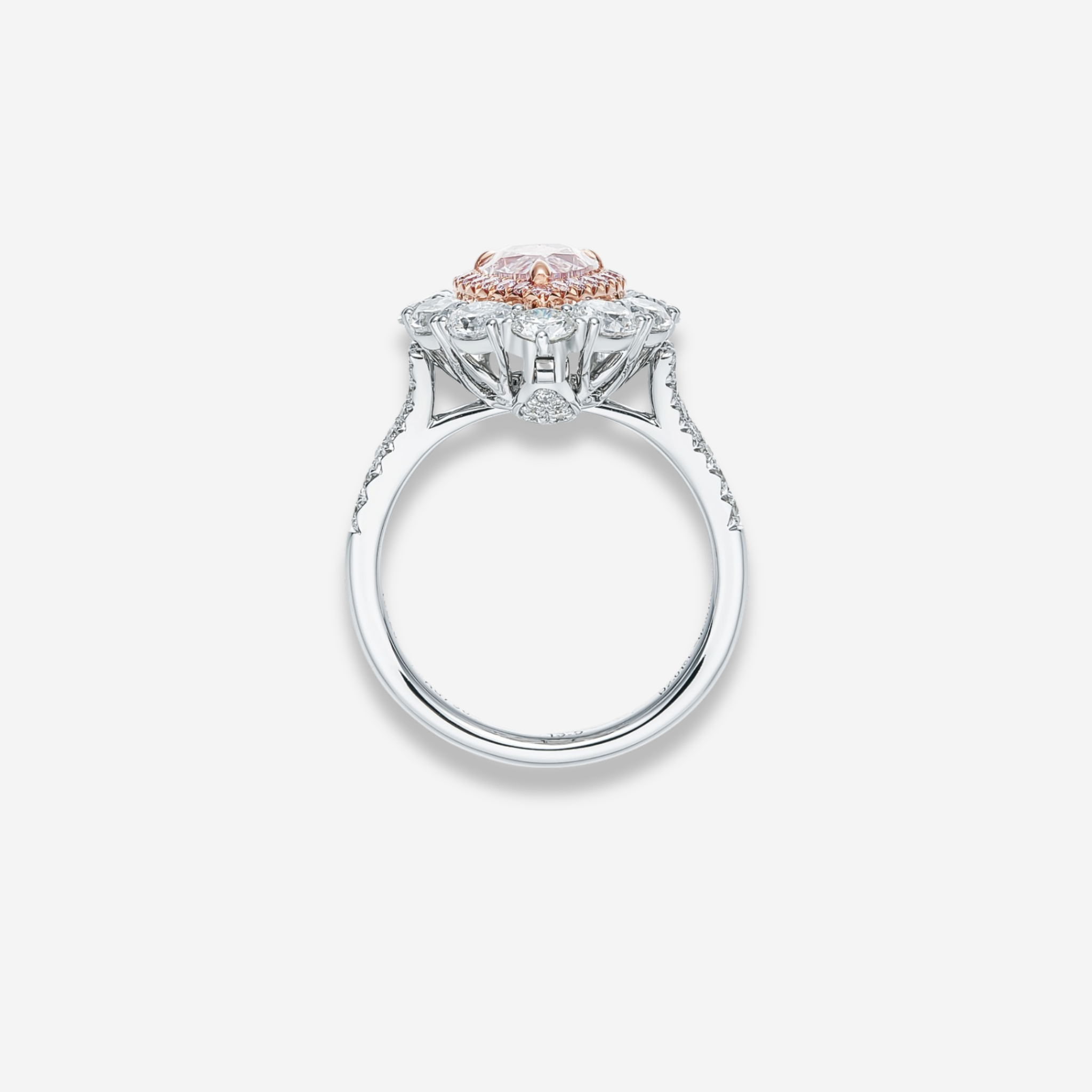 This pink pear diamond  is a luxurious and rare piece of jewelry that exudes elegance and sophistication. Not only wearable as a ring but can be converted into a pendant with ease. The pink diamond in the center of the ring is a natural wonder of the world, with a unique and stunning color that makes it stand out from other diamonds. Our master jewelers have a unique way to bring out the purest color, giving you the style of an Intense Pink for less. Learn more about pink diamonds here.