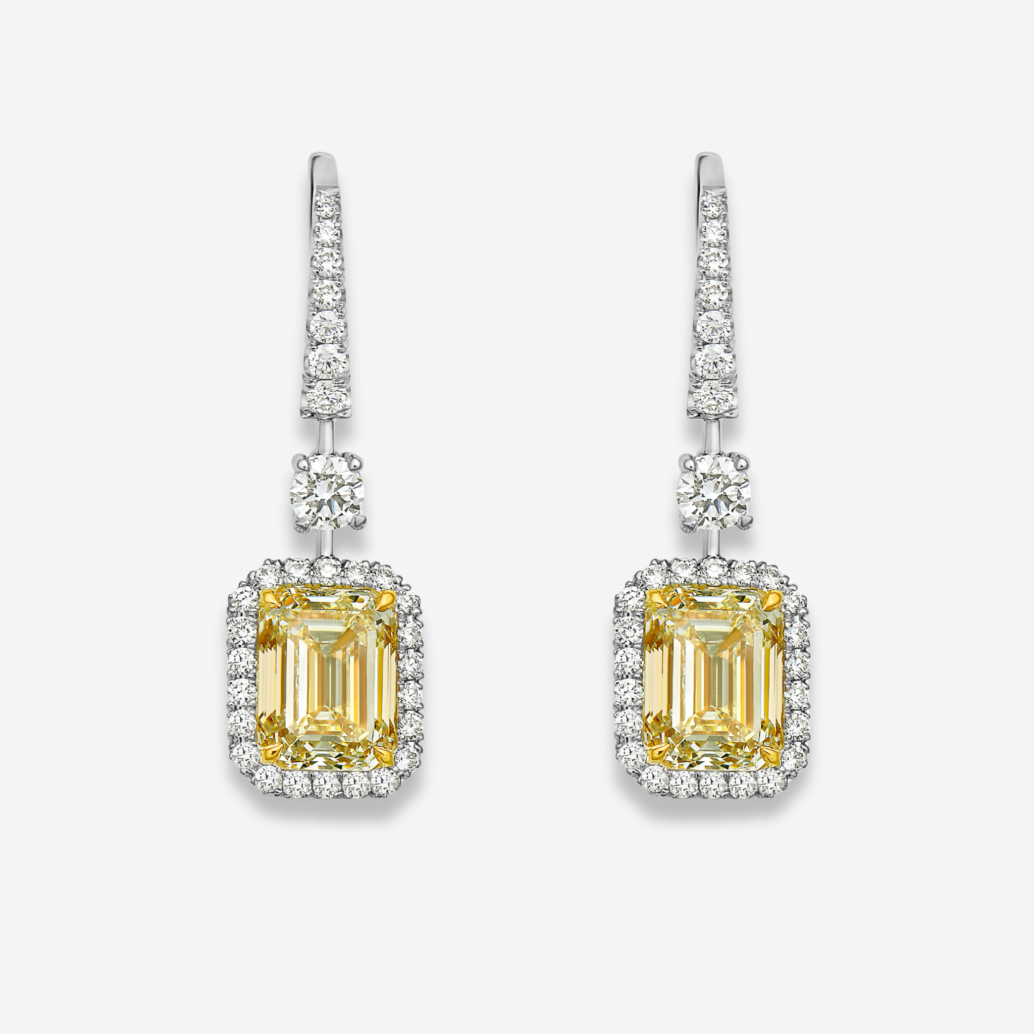 Matching yellow diamond emerald cut come around every-once in a blue moon. Emerald cut is one of the least manufactured shapes by color because the facets loose color but not in this case. Making for a one-of-a-kind classic earring that can be cherished for years to come.