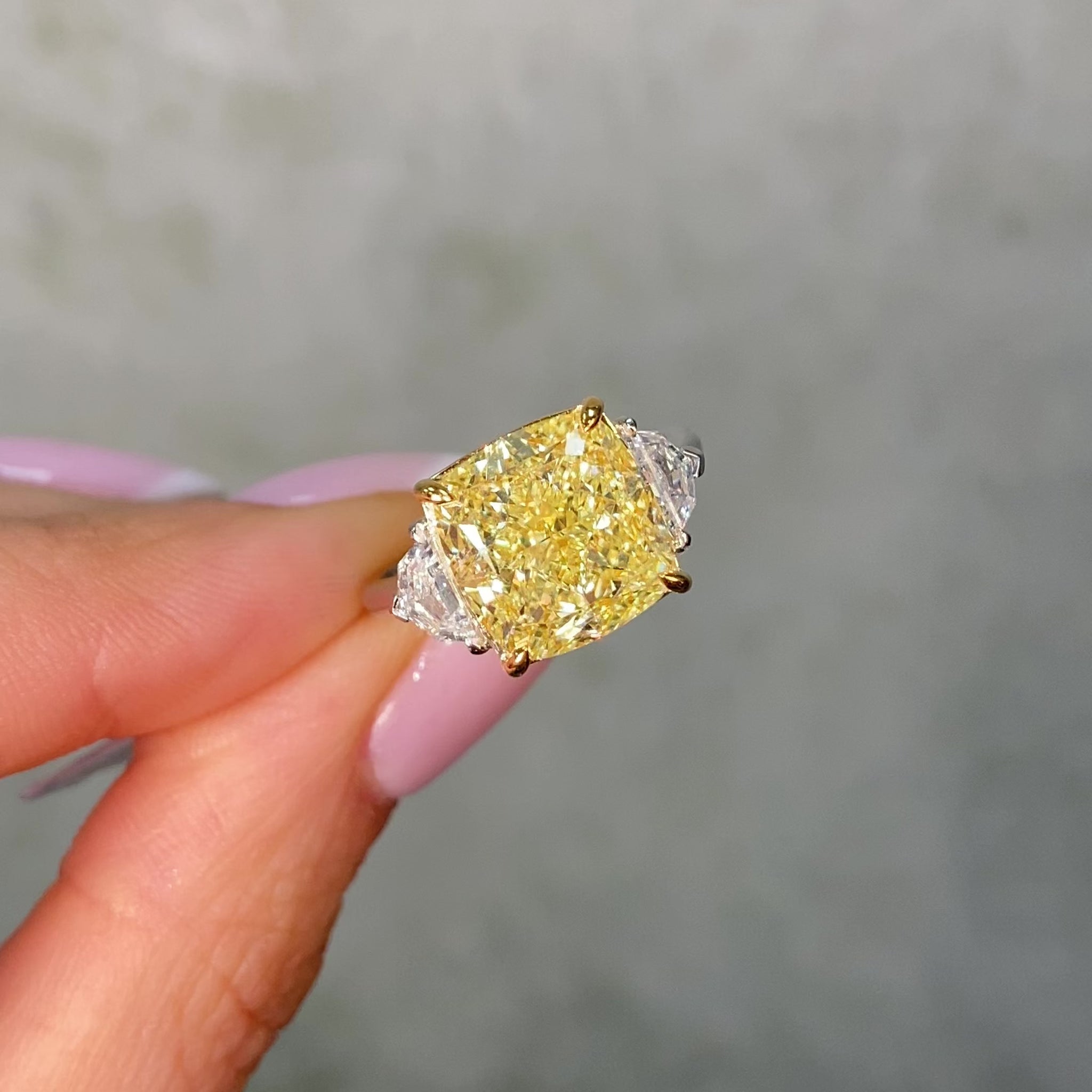 A 7.01 carat Fancy Light Yellow cushion cut diamond takes center stage, its soft hue elevated by the precision of VS1 clarity. Framed by 0.54 carats of E color VVS2 epaulette side stones, the composition highlights contrast while preserving a graceful balance. GIA certified and crafted in platinum and 18k, this ring is handmade in New York City, reflecting the Rare Colors philosophy of rarity expressed through timeless design.